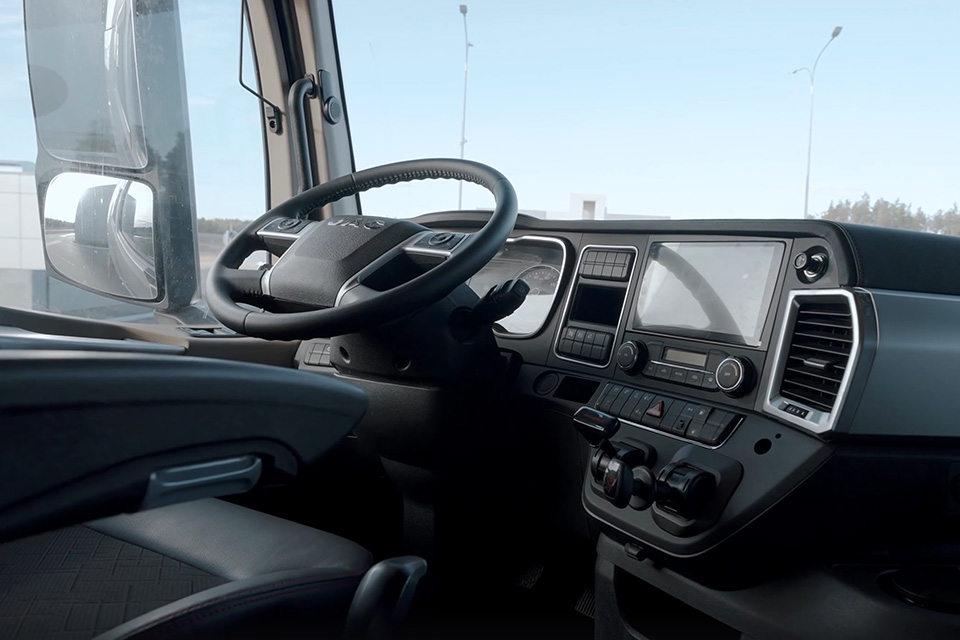 Современная система мультимедиа с сенсорным экраном диагональю 13,1 дюйма позволяет управлять не только радио и Bluetooth соединением с телефоном, но и навигацией с карты России. А информативный бортовой компьютер на приборной панели позволяет следить за множеством параметров автомобиля. На панели управления расположены пневматический ручной тормоз, переключатель баков, управление пневмоподвеской, блокировка заднего моста и другие важные элементы.